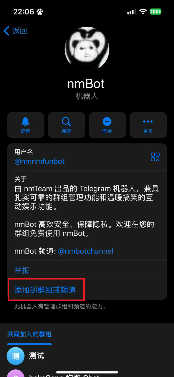 第一步:打开 nmBot 个人信息页面,在菜单中选择“添加到群组或频道”(Add to Group or Channel,根据翻译不同可能有所区别,下同)。