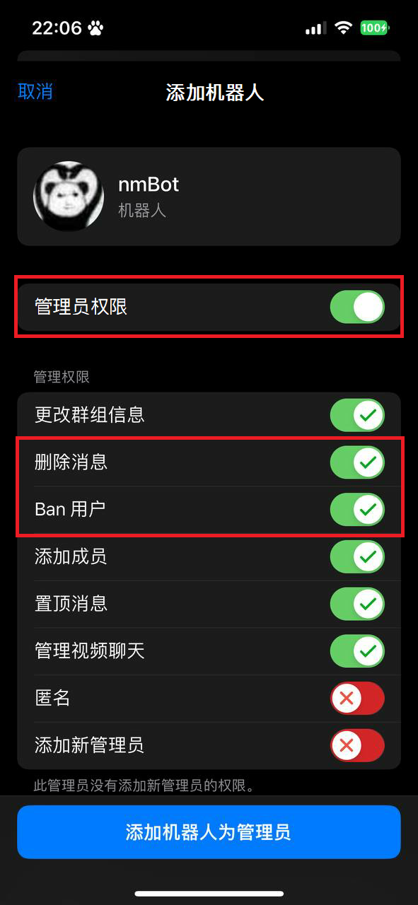 您可以在添加 nmBot 到群组时,直接设置 nmBot 为管理员。