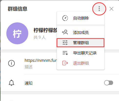第一步:打开群组信息页面,点击右上角的菜单按钮,然后选择“管理群组”(Manage Group,根据翻译不同可能有所区别,下同)。