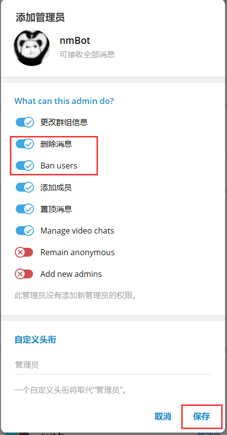 第三步:在弹出的对话框中,确保打开“管理员权限”(Admin Rights)并选中了“删除消息”(Delete Messages)和“封禁用户”(Ban Users)权限,然后选择“添加机器人为管理员”(Add Bot as Admin)。