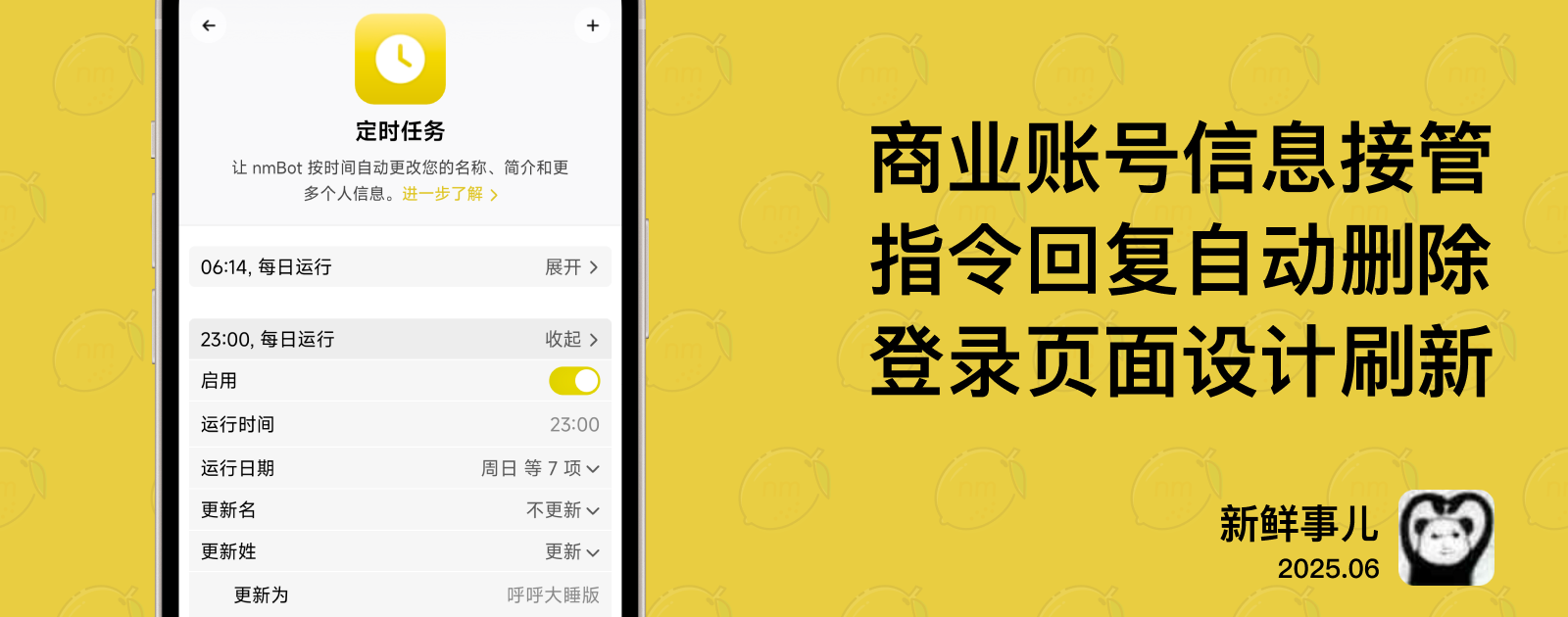 - 新增“商业定时任务”功能:商业用户可通过 nmBot 定时修改自己的名称、个人简介、用户名。
